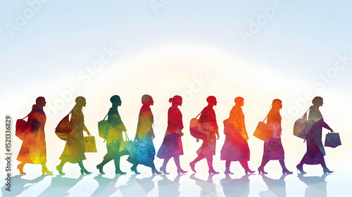 woman, people, walking, silhouette, colourful, many-coloured, fashion, travel, journey, diverse, group, line, progression, abstract, style, art, graphic, illustration, background, light, bright, pastel, colours, shadow, bag, accessory, modern, contemporary, design, digital, figure, movement, diversity, equality, hope, future, progress