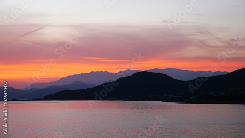 sunset, sky, sea, water, cloud, sunrise, sun, lake, landscape, nature, ocean, cloud, evening, mountain, orange, dusk, horizon, calm, dawn, beautiful, mountain, morning, sundown, view