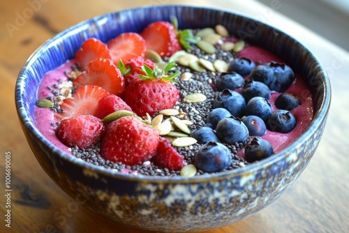 smoothie, bowl, berry, seed, nut, vibrant, healthy, breakfast, strawberry, blueberry, pumpkin, ceramic, dish, fresh, delicious, nutrient, diet, colourful, vegan, antioxidant, ripe, wholesome, protein, organic, nourishment, trendy, balanced, fruit, culinary, wooden, background, texture, raw, granola, appetising, vitamin, edible, garnish, detox, refreshing, lifestyle, epicure, morning, tasty, artistic