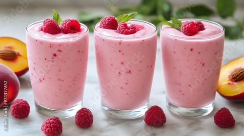 colorful smoothie featuring raspberries and peaches, served in three glasses, showcasing a delicious and healthy drink option with natural flavors and vibrant ingredients