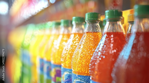soda, bottle, colourful, closeup, condensation, store, display, shelf, bright, beverage, refreshing, drink, orange, green, yellow, vibrant, glasses, plastic, cold, summer, refreshment, liquid, drink, product, shop, retail, soft drink, hydratation, sparkling, fizzy, cardboard box, stacked, row, lighting, chilled, freshness