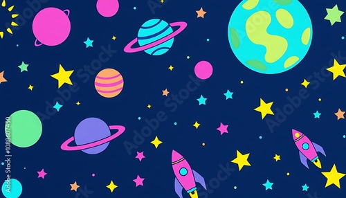 space, planet, star, rocket, universe, cosmos, galaxy, cartoon, illustration, colourful, vibrant, children, children, education, background, design, pattern, playful, fun, whimsical, artwork, graphic, vector, texture, art, astronomy, solar system, outer space, childhood, creativity, imagination, fantasy, happy, bright, pastel, pink, blue, yellow, green, purple