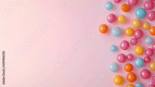 Colorful spherical candies arranged on a pastel background.