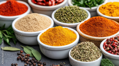 Colorful spice powders arranged in bowls create vibrant culinary display
