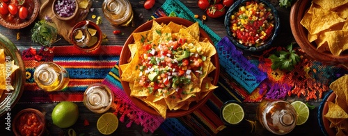 Colorful spread of Mexican food, including nachos, salsa, and tortilla chips