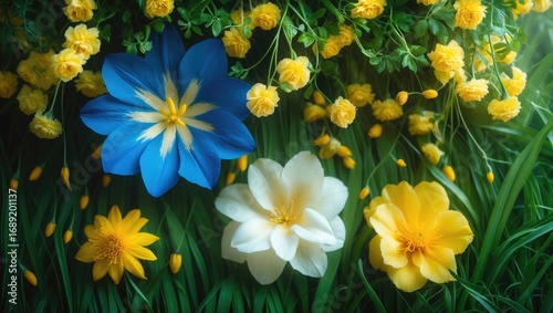 colourful, spring, flower, bloom, blue, white, yellow, vibrant, bright, blossom, foliage, grass, nature, garden, fresh, healthy, lush, seasonal, flora, botanical, ecosystem, no people