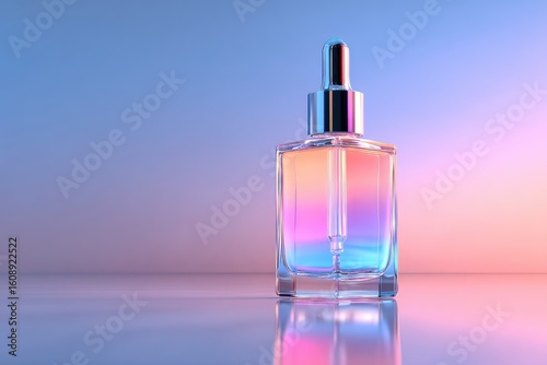bottle, glasses, dropper, square, clear, liquid, colours, pink, purple, blue, gradient, modern, perfume, cosmetic, beauty, product, cardboard box, design, aesthetic, three-dimensional, illustration, display, studio, lighting, light, soft, pastel, hue, fashion, wellness, health, care, serum, essential, oil, fragrance, luxury, minimalist, clean, empty, isolated, cosmetic