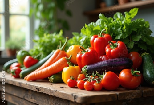 colorful stack fresh vegetables vibrant display healthy eating organic produce variety, carrot, tomato, pepper, broccoli, cucumber, onion, zucchini