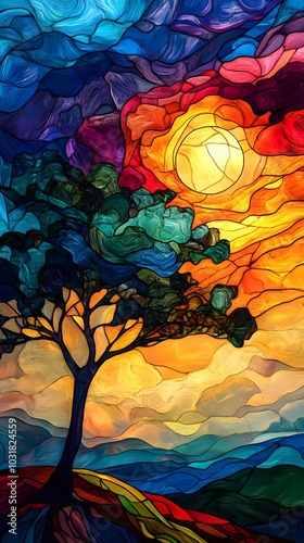 Colorful stained glass painting of an oak tree swaying in the wind, with a vibrant sunrise and a beautiful landscape
