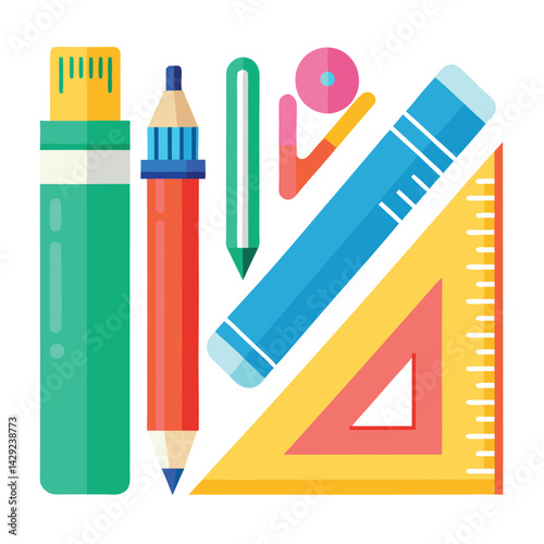 stationery, icon, vector, crayons, ruler, eraser, pen, sharpener, highlighter, marker, compass, protractor, design, school, supply, education, drawing, writing, creative, tool, colourful, flat, art, object, minimal, aesthetic, notebook, geometry, vignetting, study, learning, classroom, vibrant, student, item, graphic, isolated, illustration, doodle, outline, equipment, material, desktop, ink, brush, portfolio, case, office, accessory