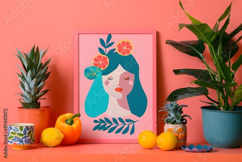 Colorful still life with a vibrant framed artwork, tropical plants, and fresh fruits.