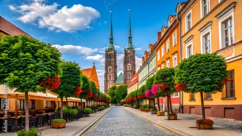 Colorful Street with Flowering Trees Leading to Cathedral in Wroclaw