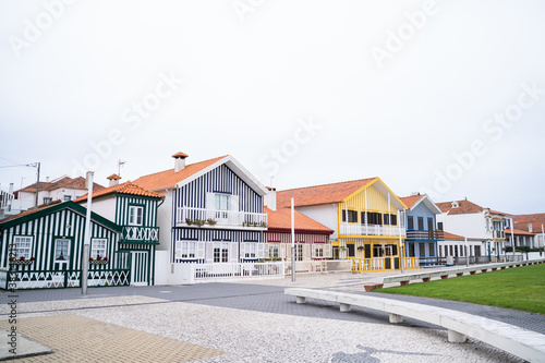 Colorful striped houses on the beach of Costa Nova. Original design in a fisherman's village. Aveiro, Portugal.