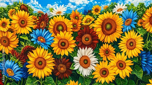 sunflower, field, summer, sky, colourful, flower, nature, art, print, painting, bright, vibrant, beautiful, garden, rural, landscape, botany, agriculture, bloom, blossom, sunny, day, happy, cheerful, majestic, yellow, orange, brown, blue, white, green, leaf, plant, floral, wallpaper, background, illustration, artwork, image, photo, design