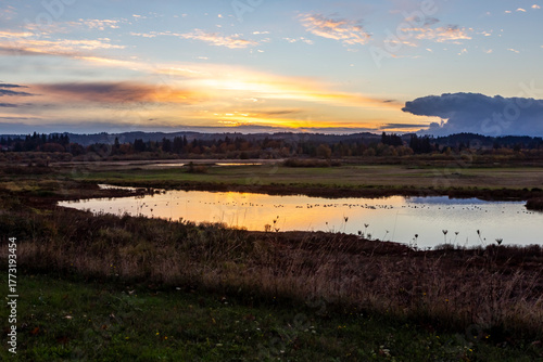 Colorful sunset over Tualatin River in Tualatin River Wildlife Refuge in Sherwood, Oregon
