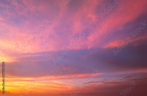 Colorful sunset sky with setting sun behind vivid orange and yellow clouds