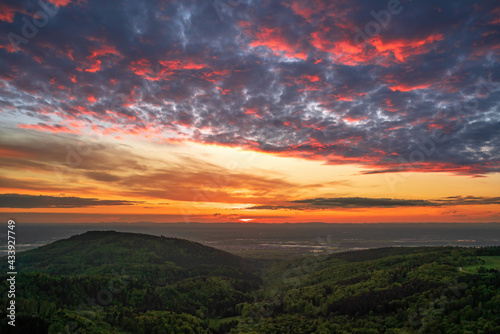 sunset, background, beautiful, black forest, blue, cloud, cloud, cloudscape, colourful, country, countryside, forest, green, hill, horizon, landscape, mountain, orange, outdoors, red sky, scenic, sky, sun, sunlight, vale, view