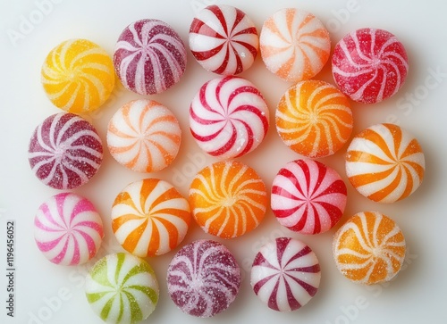 Colorful Swirled Hard Candies Arranged in a Delightful Pattern on a White Surface, Showcasing Vibrant Shades and Sweet Aromas Ideal for Festive Occasions