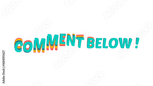 Colorful text 'COMMENT BELOW!' with a 3D wave effect. Playful typography for social media engagement, isolated on a transparent background for easy overlay. Call to action graphic.