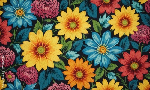 flower, pattern, floral, seamless, flower, nature, pink, spring, illustration, blossom, vector, summer, decoration, leaf, colours, ornament, texture, design, textile, colourful, orange, red, blue, sky