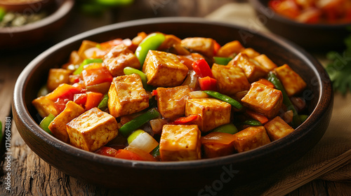 tofu, stir fry, vegetable, colourful, bowl, asian cuisine, vegan, vegetarian, healthy, food photography, food, meal, dish, cookery, soy, protein, diet, nourishment, dinner, lunch, vegetarianism, veganism, culinary, ingredient, cooking, receipe, delicious, tasty, fresh, organic, rustic, wooden bowl, table, presentation, flavorful, studio shot, closeup, pepper, onion, pea, carrot, sweet, savoury, aromatic, texture
