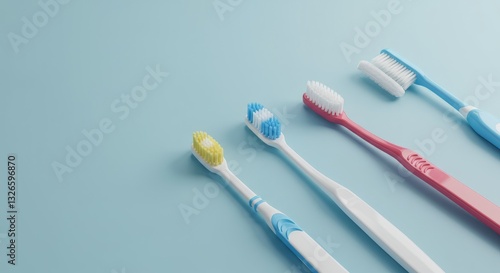 Colorful Toothbrushes on Blue Background - Four colorful toothbrushes arranged on a light blue background. Perfect for dental hygiene or oral care related content