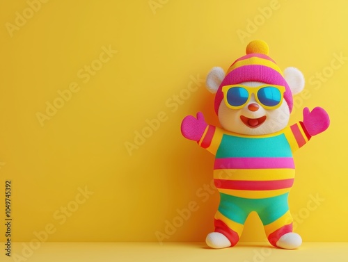 Colorful toy bear wearing vibrant striped outfit and sunglasses on a bright yellow background, exuding playful and cheerful vibes.