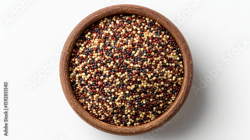 Colorful tri-color quinoa seeds in rustic wooden bowl on white background, top down view