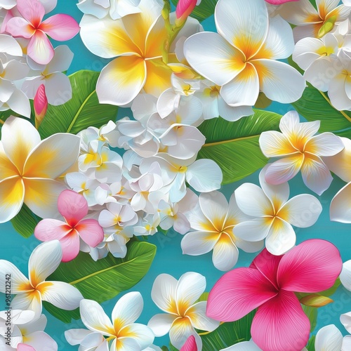 Colorful tropical flowers featuring plumeria and exotic leaves, ideal for summer, nature themes, and vibrant backgrounds.