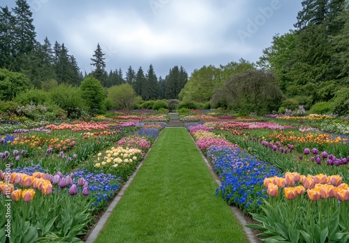 Colorful Tulip Garden with Vibrant Floral Display Under Soft Cloudy Sky Surrounded by Lush Greenery in a Peaceful Natural Setting