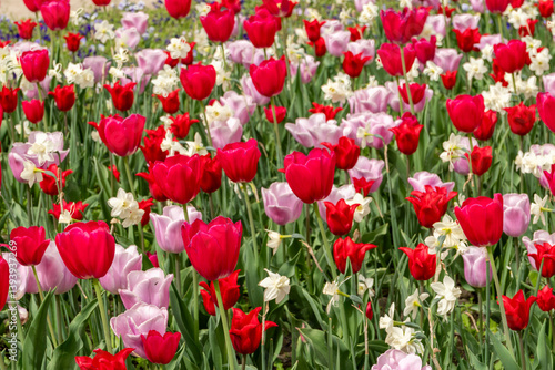 Colorful tulips blooming during spring time in a public park. Floral background and wallpaper.