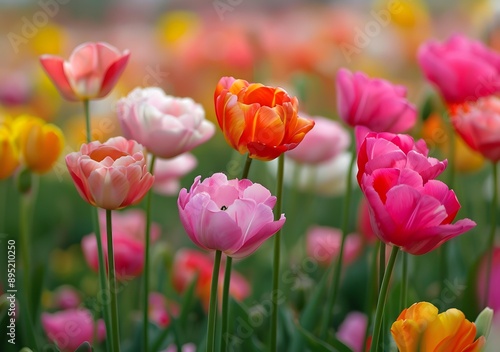 tulip, flower, spring, garden, bloom, colourful, nature, pink, orange, yellow, white, green, plant, flora, floral, macro, photo, background, beautiful, fresh, bright, vibrant, soft, delicate, field, wildflower, landscape
