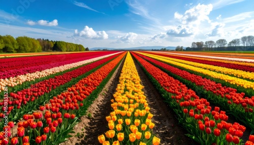 tulip, flower, field, spring, colourful, bloom, blooming, nature, landscape, agriculture, springtime, sky, blue, cloud, row, vibrant, scenic, beautiful, blossom, flora, gardening, horticulture, cultivation, plantation, colorful flowers, flower field, spring flower, dutch, holland, holland, flower garden, floral, beauty, sunny, season