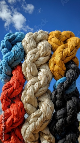 Colorful Twisted Ropes Against Blue Sky Nautical Texture