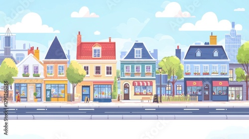 city, street, shop, building, architecture, colourful, urban, landscape, window, door, tree, road, skyline, residential, summer, neighbourhood, cloud, sunny, illustration, design, local, scene, empty, peaceful, community, graphic, nature, bright, cheerful, lifestyle, vibrant, inviting, artistic, perspective, tranquil, modern, decorative, town, visual, foreground, background, unique, relaxing