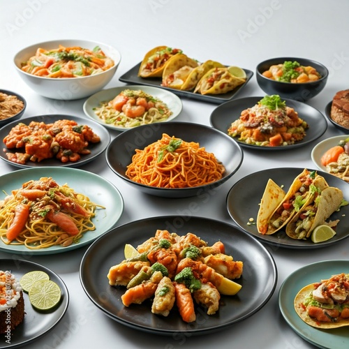 food, meal, cookery, dish, dinner, lunch, plate, table, eatery, snack, epicure, fresh, delicious, tasty, colourful, vibrant, bright, appetising, healthy, orange, yellow, green, red, brown, white, asian, mexican, spaghetti, pasta, taco, salad, shrimp, seafood, vegetable, ingredient, meat, chicken, dinnerware, setting, background, overhead, top, flat, layout, composition