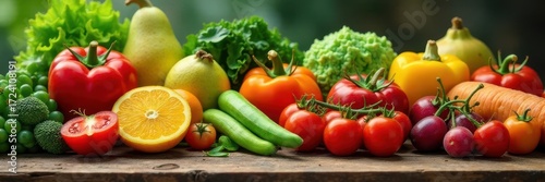 Colorful variety of fresh fruits and vegetables on a wooden table , market, dietary