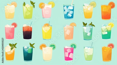 cocktail, beverage, ice, summer, refreshment, fruit, mint, lime, lemon, colourful, drink, glasses, tropical, enjoyment, celebration, party, bar, relaxing, hydratation, zest, sweetness, cheer, garnish, serving, refresh, thirst, leisure, transparent, liquid, bubbly, splash, creativity, receipe, design, vibrant, aesthetic, photo, pattern, collection, illustration, background, lifestyle, favor, coolness, feast