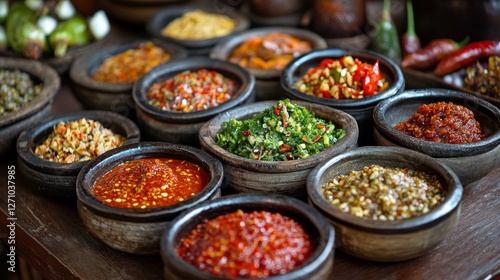 Colorful variety of spicy chili sauces in rustic wooden bowls