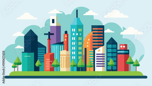 Colorful vector illustration of a modern city skyline with lush greenery and bright blue skies featuring various building styles and shapes