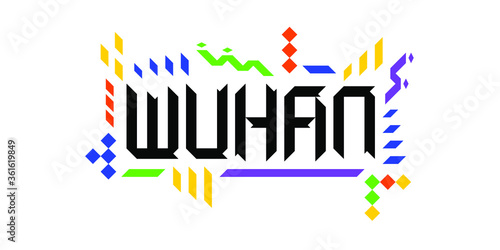 Colorful vector logo font of the city of Wuhan, in a geometric, playful finish. The abstract Asiatic ornament is a great representation of a tourism-oriented, dynamic, innovative culture of China.