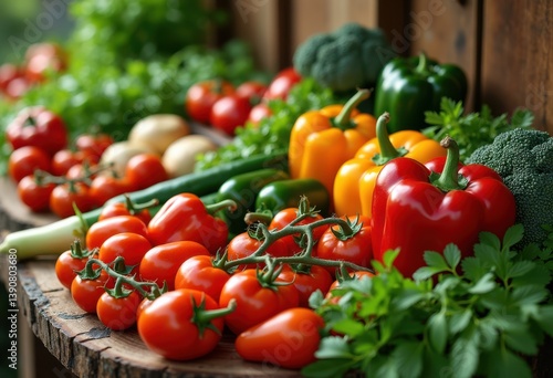 colorful vegetable display rustic wooden boards vibrant fresh produce organic arrangements natural beauty culinary art, healthy, nature, green, yellow, red