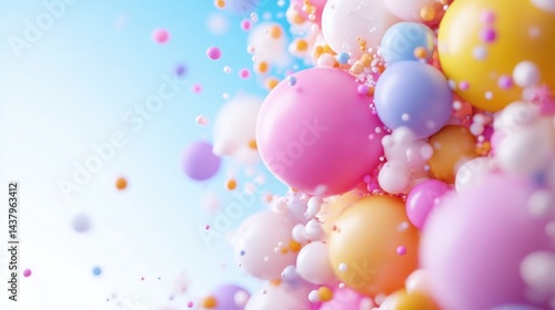 Colorful, vibrant cluster of spheres in pastel shades. A dynamic, joyful display of rounded forms, with a light, airy quality, suggesting movement and a sense of playful energy