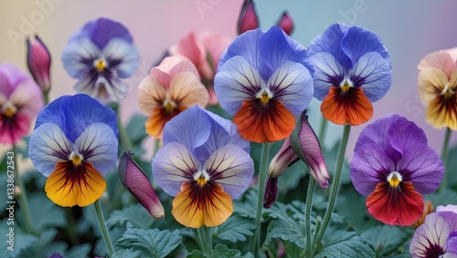 Colorful viola flowers in bloom with pastel-colored background featuring shades of blue, purple, and orange, harmoniously arranged in the garden.
