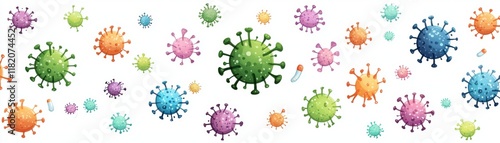 Colorful virus illustrations spread across a white background, representing viruses and microorganisms in a playful, artistic manner.