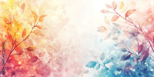 Colorful watercolor background featuring branches with leaves in shades of red, orange, yellow, purple and blue, blending into a soft and vibrant seasonal atmosphere.