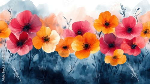watercolor, painting, colourful, vibrant, red, orange, poppy, flower, bloom, art, artistic, floral, nature, illustration, decorative, design, flower petals, stem, leaf, botanical, spring, summer, bright, garden, creative, beauty, pattern, artwork, fine art, background, elegance, hand-painted, high-coloured, contrast, detailed, composition, imaginative, atmospheric, tranquil, soothing