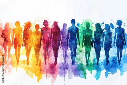 Colorful Watercolor Silhouettes of Diverse Female Figures Walking Together