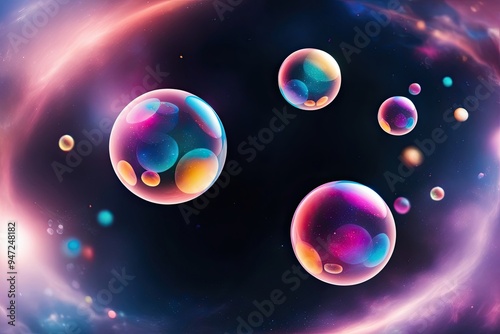 Colorful Whimsical Bubbles in Dark Space with Blurry Galactic Background Effects