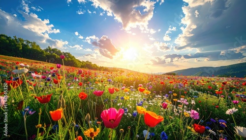 Colorful Wildflower Field at Sunset with Dramatic Sky and Golden Light Warm Hues Rolling Hills and Bright Sky Vibrant Colors